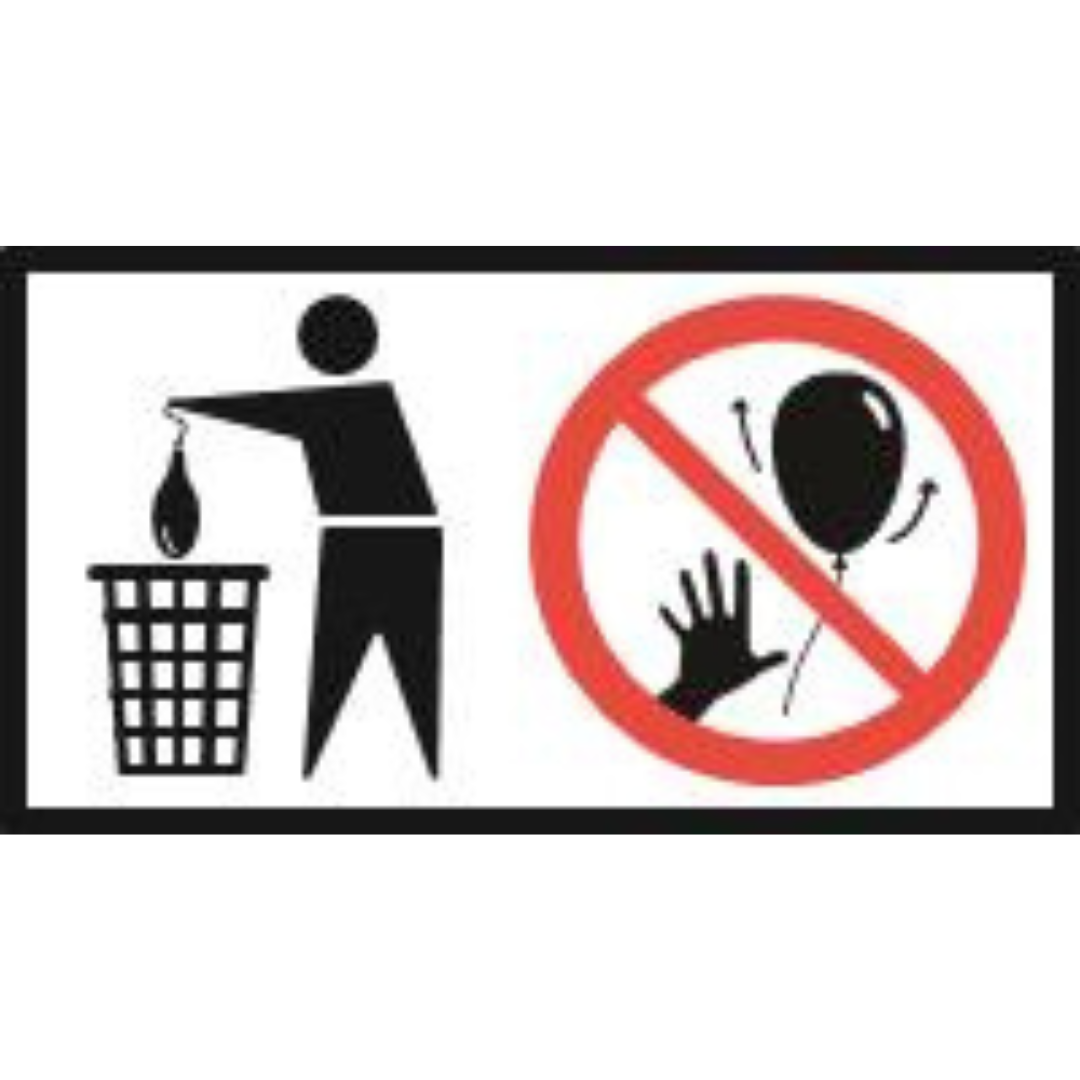 Vi anbefaler derfor altid at balloner sprænges og smides i affaldsspanden efter brug.